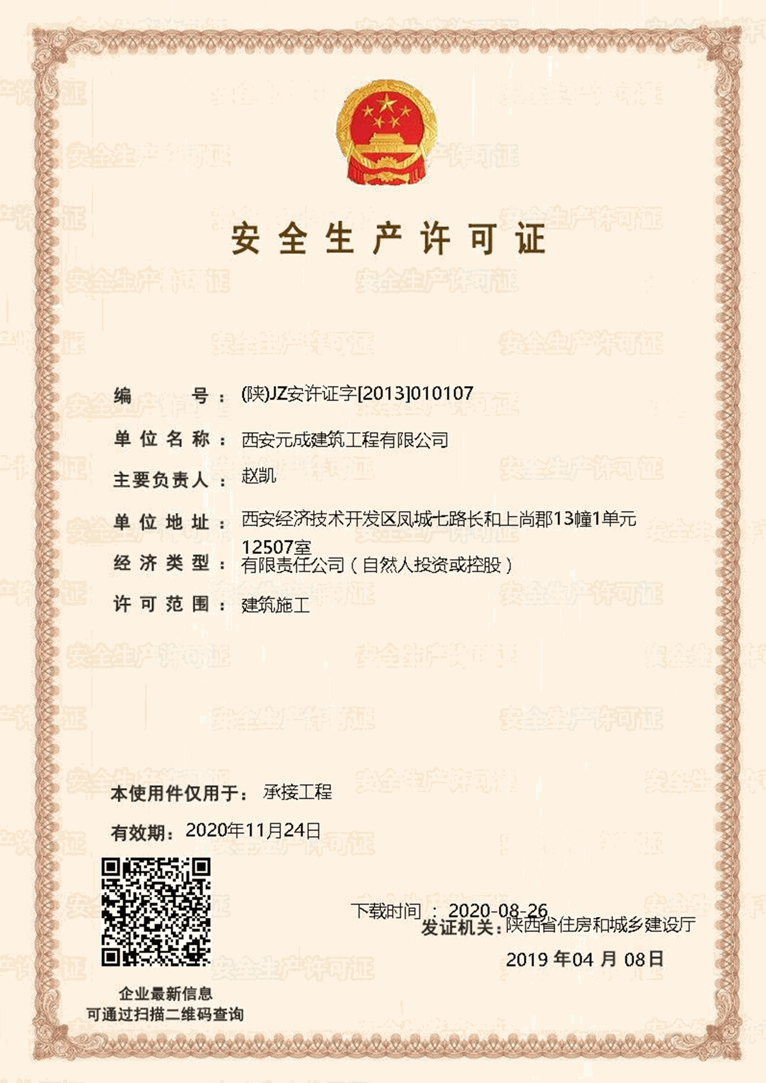 西安元成建筑工程有限公司成立于2012年,是一家擁有建筑工程、市政公用工程、石油化工工程、機(jī)電工程施工總承包貳級(jí);鋼結(jié)構(gòu)工程、防水防腐保溫工程專(zhuān)業(yè)承包貳級(jí);電力工程、水利水電工程施工總承包叁級(jí);建筑機(jī)電安裝工程、輸變電工程、環(huán)保工程專(zhuān)業(yè)承包三級(jí);模板腳手架專(zhuān)業(yè)承包、勞務(wù)分包等綜合性施工企業(yè)。